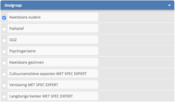 Als ‘consulent ’ zie je in het overzichtsscherm de patiënten van alle MDO groepen waarvan je consulent bent. Indien je aan meerdere groepen verbonden bent, selecteer dan in het uitrolmenu in het vakje ‘Filter op doelgroep’, de groep waar je op wilt voorbereiden.
