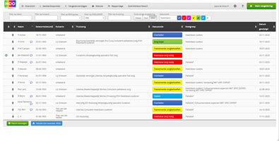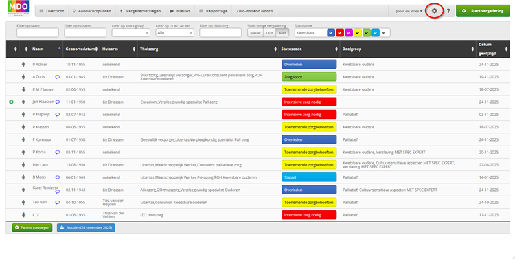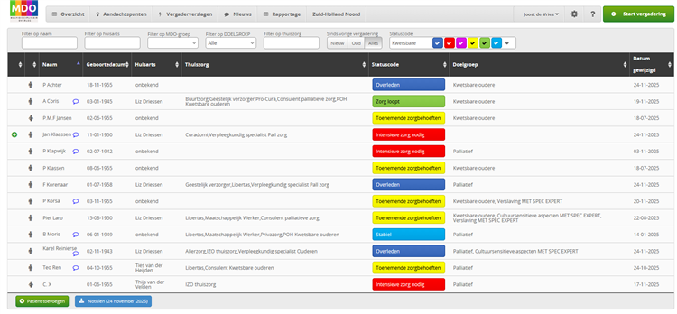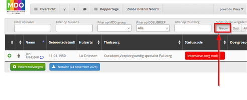 Als je in de menubalk met de filters op ‘Nieuw’ klikt, krijg je alleen de patiënten in beeld die sinds de vorige vergadering zijn toegevoegd. Deze zijn ook herkenbaar aan het groene plusje voor de naam.