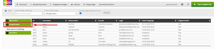 Klik vervolgens op die pagina op ‘Vergaderingen’ om de vergaderplanning te openen.