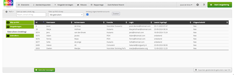 Overzicht van deelnemers MDO incl. hun contactgegevens (naam, Email en mobiel nummer), functie en BIG nummer.