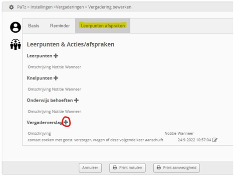 Per knelpunt, leerpunt of onderwijsbehoefte kan een notitie (bijvoorbeeld een voorgenomen actie of ander commentaar) worden gemaakt. Indien deze is opgepakt kan dit hier ook worden aangegeven.