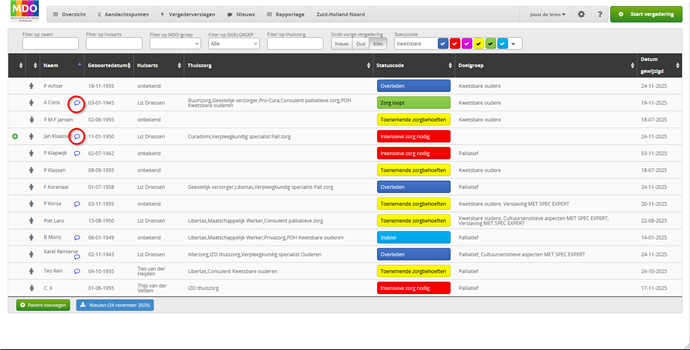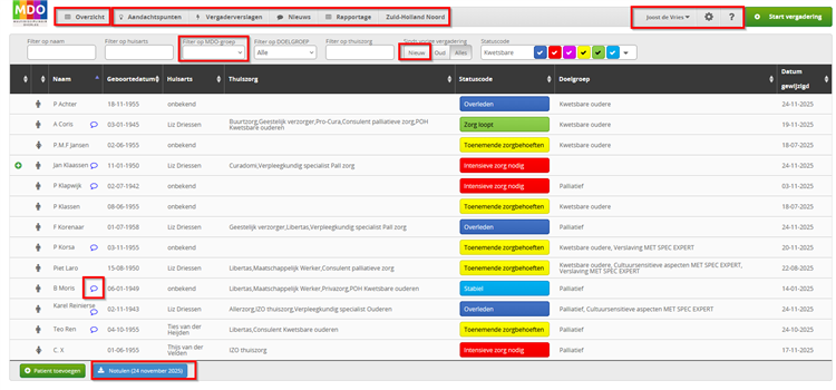 Als je in de menubalk met de filters op ‘Nieuw’ klikt, krijg je alleen de patiënten in beeld die sinds de vorige vergadering zijn toegevoegd. Deze zijn ook herkenbaar aan het groene plusje voor de naam.