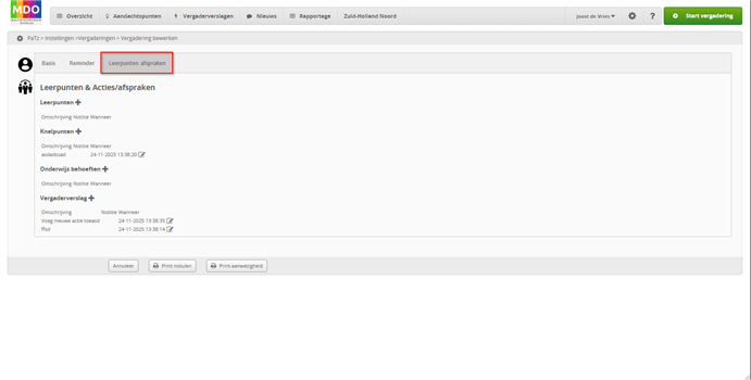 3e tabblad (geel gemarkeerd) bevat naast de Leerpunten,Knelpunten en Onderwijsbehoeften bij Vergaderverslag ook de genoteerde Actiepunten.