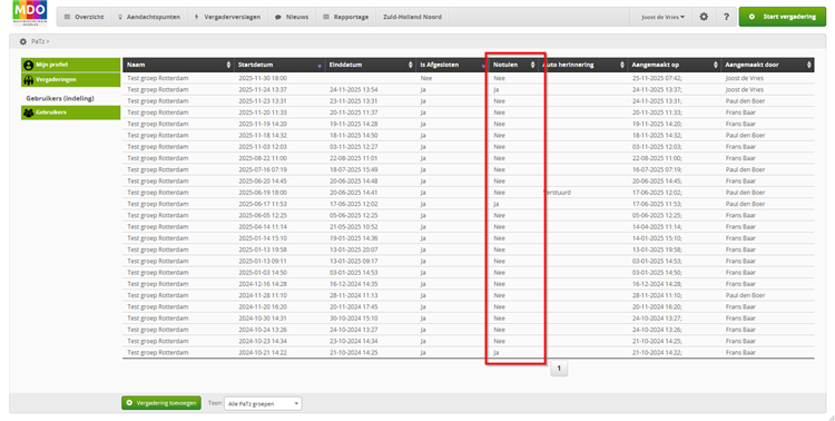 Zolang de notulen niet verstuurd zijn, kan het vergaderverslag nog aangevuld worden door op de lijst bij Notulen op ‘Nee’ te klikken