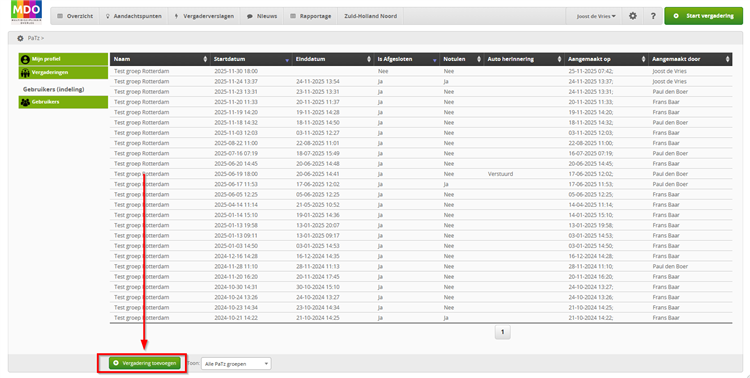 Klik op de groene knop "Vergadering toevoegen" een een vergadering aan te maken.