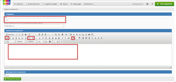 De titel is verplicht. Kies een korte en bondige titel. Houd het bericht eenvoudig. De knoppen voor vet en ‘Opsommingen’ zijn hierboven gemarkeerd. Tevens kun je een hyperlink in jouw bericht opnemen.